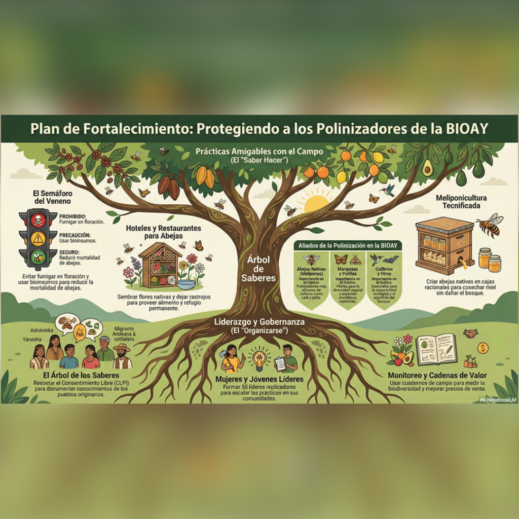 Diseñamos un Plan de Fortalecimiento de Capacidades con enfoque por competencias y una Caja de Herramientas educativa multiformato dirigida a agricultores, apicultores, meliponicultores, comunidades locales y técnicos. Este producto integra saberes tradicionales Yánesha y Ashaninka, promueve prácticas amigables con los insectos polinizadores y responde a las brechas de conocimiento y capacidades existentes. Este producto fue elaborado para PROFONAMPE.